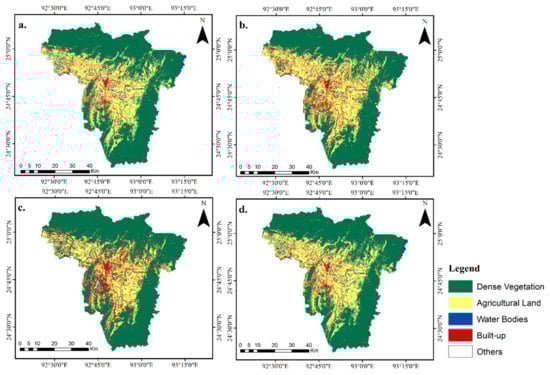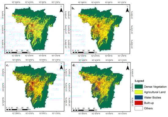 LULC of Cachar for the years (a) 1990, (b) 2000, (c) 2010, and (d) 2020.