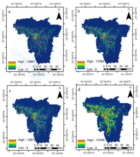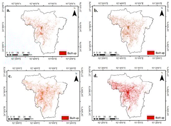 Change in built-up areas of Cachar for the years (a) 1990, (b) 2000, (c) 2010, and (d) 2020.