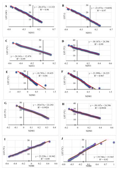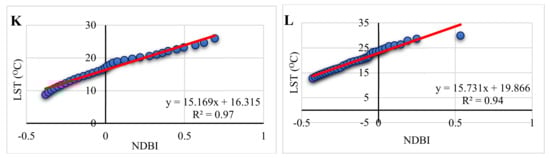 In order to characterise the land cover class that was related to LST, NDBI, NDVI, and NDWI were used. In prior research, NDVI was utilised for the monitoring drought, agricultural production, and the density of vegetation [43,44,45,46]. The NDVI was computed by making use of the following Equation (12). The NDBI can be used as an indication of the built-up area because of its sensitivity to urban environments. The NDWI is utilised for the purpose of monitoring the water content of vegetation and calculated using Equation (23) [47,48]. One of the most important categories of land cover is represented by the normalised difference build-up index (NDBI), which measures built-up areas calculated using Equation (23) [49]. In order to explore the connection between LST and various land cover indices, the method of randomly selecting points and applying it was used [22,45,50], and the coefficient of determination was calculated.