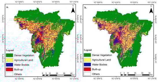 - Annayat, W.; Ashwini, K.; Sil, B.S. Monitoring Land Use and Land Cover Analysis of the Barak Basin Using Geospatial Techniques. In Anthropogeomorphology; Springer: Cham, Switzerland, 2022; pp. 427–441. [Google Scholar] [CrossRef]