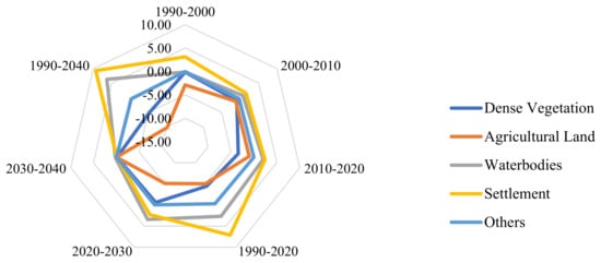 The investigation of LULC changes is important for simulating the future LULC [22]. It is observed that the built-up growth has been significant in the Silchar city. This is also in accordance with the findings in the paper. Figure 9 illustrates the contribution of net transition from different land cover to the built-up area. Table 5 shows the decadal changes in LULC during 1990–2000, 2000–2010, 2010–2020, and 1990–2020. From this table, we can say that the authentic built-up area growth, which was 196.63 km2 (about 5.2% of total area) in 1990, was extended to 314.28 km2 (8.31% of total area) in 2000, 374.62 km2 (9.9% of total area) in 2010, and 466 km2 in 2020 (12.32 % of total area). It is understandable that the role of human influence has caused the change in LULC dynamics. A decrease in dense vegetation and agricultural land cover can be seen by 60.92% and 29.99% in 1990 to 56.46% and 24.95% in 2020, respectively. Similarly, an increase in water bodies can be observed by about 3.47% in 1990 to 6.16% in 2020. The overall change (from 1990 to 2020) in the water bodies was observed as +2.96%, as overall water body coverage in 1990 was 131.19 km2, which was increased to 232.78 km2 in 2020. There is also a change in the other classes for the same period, which is measured as 0.42% (15.73 km2) to 0.11% (4.04 km2). This shows how the direct influence on different LULC classes became visible in rapid built-up area growth during 1990–2020. Table 5 shows that, in the past 30 years, the area of built-up land and water bodies has increased by 7.13% and 2.69%, respectively. Similarly, a net loss of dense vegetation and agricultural land is 168.75 Km2 (4.46%) and 190.57 Km2 (5.04%) of their area, respectively. The decline in land classified as “Others” (0.31%) was transferred to built-up areas and water bodies gradually during 1990–2020. These changes may have contributed to an increase in the built-up area due to economic development and commercial activities in the study region.