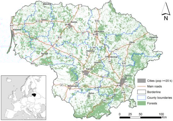 The study area with forest cover, main roads and the boundaries of the country’s ten counties is shown in Figure 1. Data on the counties of Lithuania and forest cover dynamics are from the Official Statistics Portal [23,24,25]. Data on regulations concerning red deer management were collected from official sources [26,27,28,29,30].