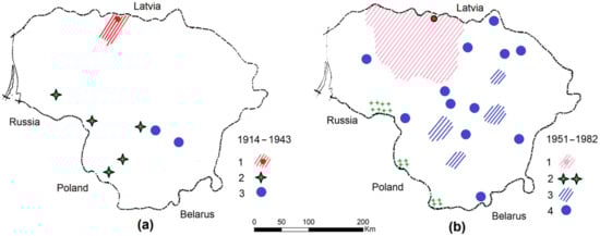 Reappearance of red deer in Lithuania after 1914: (a) first records, 1—initial location, 2—registrations of wandering individuals coming from neighboring countries, 3—first releases; (b) further expansion and reintroductions, 1—spread from the initial location, 2—location of herds formed by immigrations, 3—introductions, 4—records of the spreading deer groups and individuals. Redrawn from [56].