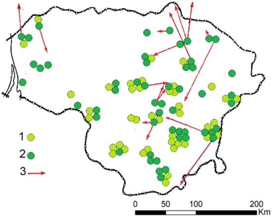 Red deer translocations in Lithuania, 1969–1983: 1—translocation with <10 individuals, 2—translocation with >=10 individuals, 3—direction and distance of migrations. Redrawn from [56].
