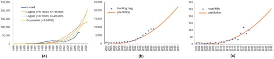 Prediction of the growth of C. elaphus numbers (a), hunting bag (b) and numbers road-killed (c) in Lithuania, 2030.