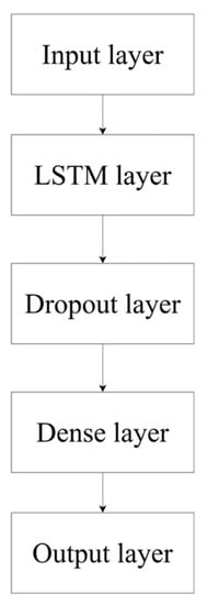 The structure of LSTM is shown in Equations (1)–(6). There are four components in the LSTM: a forget gate (ft), an input gate (it), an output gate (ot), and a memory cell (). This cell retains values over time intervals, and the three gates are responsible for controlling the flow of information into and out of the cell. At time t, the cell is fed with input xt and the hidden state ht−1 at time t − 1. The forget gate ft, the input gate it, the output gate ot, and the memory cell are calculated as follows: