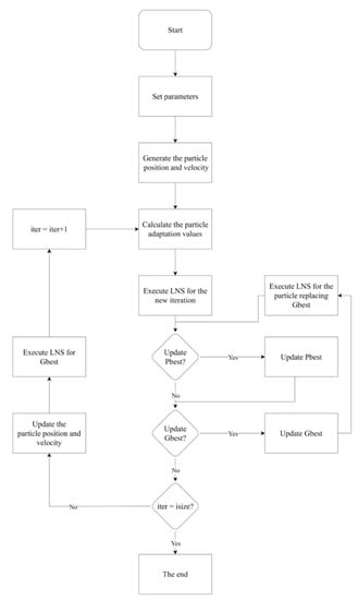 We determine whether the adaptation value of each particle (for 1 ≤ pindex ≤ psize) in iteration (generation) iter is better than Pbestpindex (set Pbestpindex = if it is the first generation of particles). If it is, then replace Pbestpindex; thereafter, determine whether the Gbest update condition is met (if it is the first generation of particles, then set Gbest = best solution for all first-generation particles). If the particle is inferior to Gbest, then Gbest remains unchanged; if the particle is not inferior to Gbest, then the particle replaces Gbest, the particle updates the velocity and position, and LNS is performed for the particle (see Execute LNS for the New Iteration).