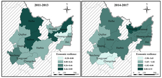 Agricultural economic resilience of 12 cities in Sanjiang Plain and Songnen Plain from 2011 to 2017.