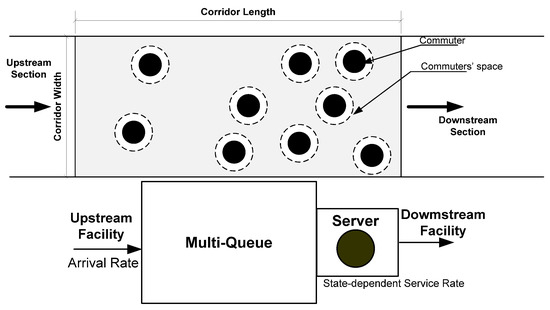 Inspired by the study conducted in [25], in this research, we also describe the metro rail transit corridor as a rectangular facility, as shown in Figure 1. As commuters enter the corridor facility from any upstream facility or entrance gate, they occupy the spaces. The empty spaces along the corridor serve as “multiple servers.” When occupied by commuters, these numerous servers stay operational. The total number of these multiple servers, which is also the corridor facility’s capacity, is contingent on the length , width , and congestion density of commuters . The occupation of these vacant spaces increases commuter density . When all vacant spaces are occupied, commuters remain stationary and the flow halts. Jam density refers to the commuter density corresponding to a jam condition in the corridor facility of a metro rail transit station. Consequently, the capacity of the corridor facility at a metro rail transit station can be determined using Equation (1).