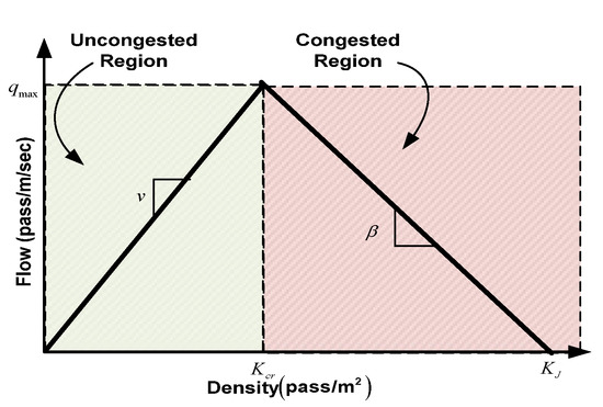 Due to the limited capacity of the corridor facility, the number of empty spaces reduces as the number of commuters increases. In the COVID-19 situation, to ensure safety by restricting the spread of virus and blocking the transmission chain, safety measures are implemented, such as appropriate social distancing and wearing facial masks. Therefore, the passenger flow analysis is done and considers both congested and uncongested conditions, which can be explained by the fundamental triangular diagram in Figure 2.