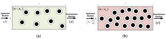 In this section, we discuss the formulation of a mathematical queuing model for a corridor at a metro rail transit station considering the unidirectional flow of commuter traffic from an upstream service facility to a downstream service facility in the COVID-19 scenario, as depicted in Figure 3. The arrivals are assumed to occur in a Poisson process with fluctuating rates. To ensure safe distancing in the COVID-19 situation, the arrival demand remains constant when the number of commuters is less than critical numbers and the arrival demand becomes state-dependent when the corridor operates in congested conditions, as shown in Table 1. When the corridor is saturated, the average arrival demand of commuters drops at the rate of as there is a queue downstream ahead of the arriving commuters. The average arrival interval will increase due to deceleration of arriving commuters. Similarly, the service flow rate of the corridor facility at the metro rail transit station is based on the triangular flow–density model (Figure 2).