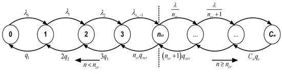 The service process at the corridor facility is also assumed to occur in an exponential process with a state-dependent service rate . Therefore, based on the above analysis, in order to formulate our proposed model for the performance assessment of corridor facilities at a metro rail transit station in the COVID-19 situation, we employ the birth–death (BD) process [26]. A multiservice finite-capacity queuing system, when the arrival and service processes are state-dependent, the state transition diagram for the process is shown by Figure 4. The vertical dotted line demarcates the congested and uncongested conditions. From the state-transition diagram, we can develop an infinitesimal generator matrix with birth rate and death rate , which is given by Matrix P.
