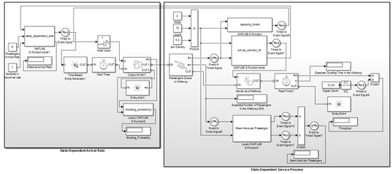 As shown in Figure 5, the DES framework was developed in the SimEvents® module of MATLAB in order to test the precision of our proposed modified queuing model for the flow of commuters in the corridor of the metro rail transit station in the COVID-19 scenario. This was done in order to ensure that our model accurately represented the flow of commuters. The FIFO Queue blocks, which serve as a queuing space for the commuters, the Server blocks, which act as multiple services where commuters stay for a certain period of time, and the Generator block, which generates the commuters at a given inter-arrival time are the essential building blocks for the development of a SimEvents®-based DES framework. The commuter inter-arrival time is the reciprocal of average commuter arrival rate. Level-2 S-function blocks compute the state-dependent service flow rate under congested and uncongested conditions. Since the corridor has a finite capacity, a mechanism is embedded in the DES framework that stops the commuters from entering the facility when the number of commuters becomes equal to the capacity of the corridor.