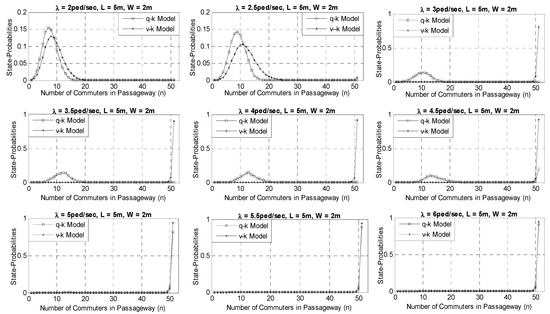 In order to verify precision, tests were performed on corridors of metro rail transit stations with different lengths and widths. The area of each corridor is equal to 8 × 2.5 m2 and 5 × 2 m2. Similarly, tests were performed with different commuter arrival demand, which are obtained from the field survey data. The performance measures (shown in Table 2), including the blocking probability , expected number of commuters in the corridor (EN) and average area occupied per commuter (EA), are computed by our proposed model and verified by the state-dependent DES framework.