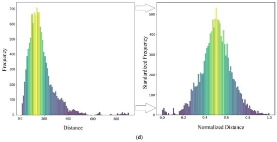 Histogram of variables before and after normalization and standardization. (a) Original and transformed distances to the nearest hospital; (b) Original and transformed distances to the nearest clinic; (c) Original and transformed distances to the nearest pharmacy; (d) Original and transformed distances to the nearest laboratory.