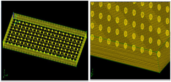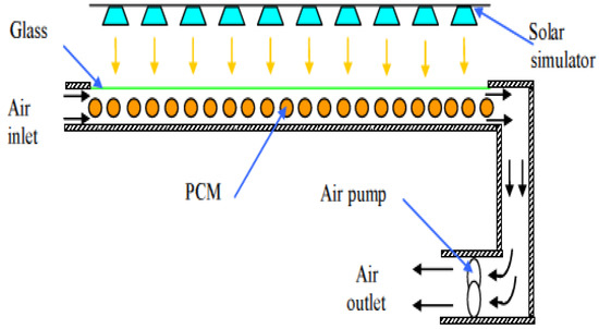 The thermocouple’s location in the collector to monitor the actual and accurate air temperature is shown in Figure 4. The simulation program was written using CFD software using GAMIT software to determine the outlet air temperature as well as the discharge time for the heater of solar air integrated using the PCM spherical capsules with any input parameters changes [34,35]. The model with boundary conditions was converted to algebraic equations by means of finite-volume techniques with fully implicit temporal differentiation, using three-dimensional spherical capsule in a staggered arrangement. The delusive terms were evaluated using central differences scheme as shown in Figure 4.