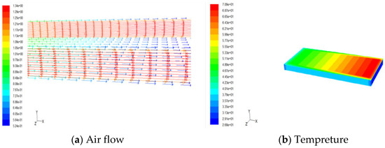 From Figure 5a,b, with increasing Re = 42,751 both airflows will increase min = 0.524 to max = 1.34 m/s to and temperature will increase from 26.8 to 70.9 °C.