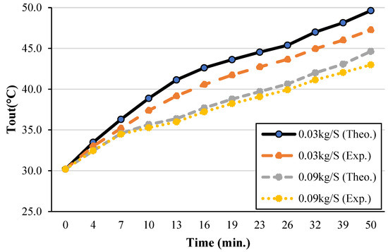 In general, when the mass flow rate increased, the instantaneous rising in the air temperature decreased while the heat exchanging after the capsule number T14 became low for the inlet temperature 30 °C, the air temperature became stable, and the heat exchanging became low after capsule T5 for the inlet temperature 30 °C as shown in Figure 6. Along with (t = 100 min) the air collector was integrated with the PCM unit for different mass flow rates.
