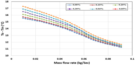 Figure 7 shows the inlet temperature was 30 °C and the storage material was the pure paraffin wax, the temperature rise (To − Tin) decreased from 15.57 °C to 11.13 °C at the mass flow rate of 0.01 kg/s the mass flow rate of 0.09 kg/s. After adding 0.5% aluminum powder, the temperature rise decreased from 16.57 °C at the mass flow rate of 0.01 kg/s to 12.2 °C at the mass flow rate of 0.09 kg/s.