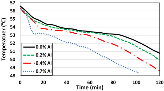 The optimizing additive ratio was increased from 0.1% to 0.7% to check the suitable mass additive so that it could be used with paraffin wax. Figure 8 shows that an increase in the mass additive will result in an increase in cooling rate and an improvement in discharge time. The PCM appeared to behave as a sensible storage material that would reflect on the outlet air temperature for the mass additive 0.6%, but the solidification time also decreased and the cooling rate increased. As a result, the mass additive of 0.5%, which was used in the majority of our experiments, produced the best results.