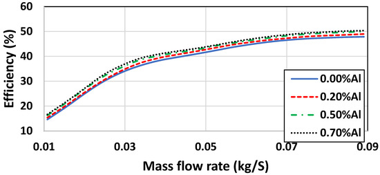 Figure 9 illustrates the performance of the thermal storage system in an additive ratio at a certain time (t = 100 min). The thermal storage efficiency was determined for various mass flow rates and various aluminum ratios. The tested mass additives in the PCM-aluminum compound material were 0.1, 0.2, 0.3, 0.4, and 0.5 of aluminum. The temperature of the outlet air and the system’s solar thermal efficiency were also tested. The thermal storage capacity for the pure paraffin wax and the compound was 71%, and 76.8% of the mass flow rates 0.05 kg/s and 0.07 kg/s, respectively. So, the mass flow rate of 0.05–0.09 kg/s did not drastically affect the thermal storage efficiency.