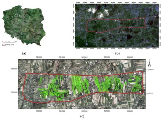 Area of the study: (a) general map of Poland; (b) terrain of the analyses—marked red (background: PlanetScope imagery, 2019); (c) analyzed plots—forest succession on abandoned farmlands; marked green (background: orthophotomap, 2019; coordinates system: PL-PUWG1992).