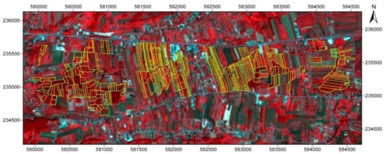 The study area—PlanetScope imagery, CIR (color infrared) composition. Analyzed parcels—forest succession on the abandoned land; marked yellow.