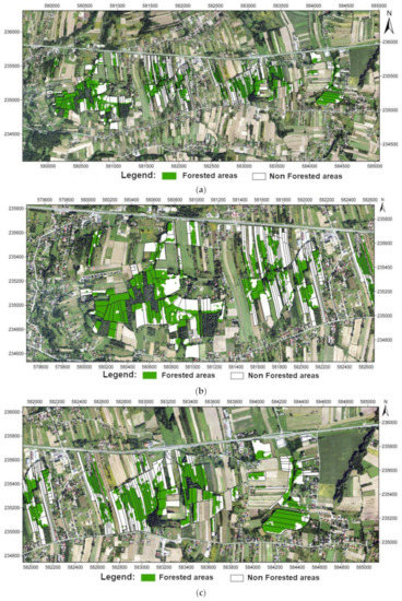 The forested areas for the analyzed area: (a) whole area; and zoom to (b) left, and (c) right side.