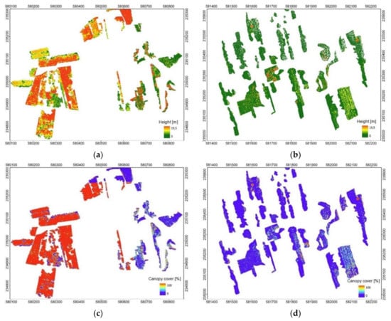 The results of the ALS (2019) processing—vegetation height (95th percentile) and canopy cover [%] zoom in to (a,c) left side; (b,d) middle side of the analyzed area.