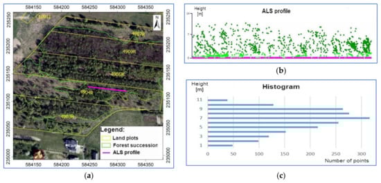 The chosen part of the area—(a) orthophotomap; (b) ALS point clouds profile; (c) histogram (number of points).