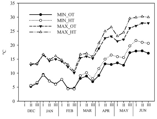 During the test period, in the two environments (OT and HT), the maximum and minimum temperature were recorded and the data are reported in Figure 1.