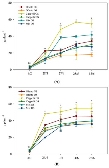 Accumulation of total dry matter during the crop cycle as affected by two sowing times: ordinary (OS) and delayed (DS) in the two environmental conditions ((A) ordinary temperatures, and (B) high temperatures). Vertical bars indicate standard error; ns, *, and **: not significant or significant at p ≤ 0.05 and 0.01, respectively.