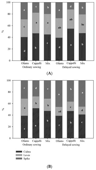 The interaction between sowing time and variety significantly affected the percentage accumulation of dry matter between the parts of the plant in both environments (Figure 4). Under high temperatures (HT), Ofanto showed the highest percentage incidence of spikes in both sowing times due to its reduced size, typical of the modern varieties (Figure 4A). Instead, the variety Cappelli, a high-size traditional variety, produced a greater quantity of biomass, with the consequent lowest incidence of spikes.