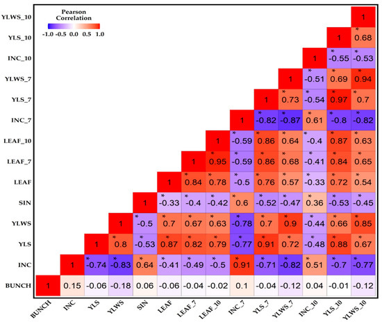 Heatmap of correlation coefficient among epidemiological parameters and numbers of banana bunches. (*) Pearson correlation (p ≤ 0.05) is shown between variables described in this study. Note: Bunch: number of harvested bunches; infection index (INC) in plants in the acorn stage, infection index in plants at 7 weeks of age (INC_7) and 10 weeks of age (INC_10); youngest leaf with symptoms on plants at the acorn stage (YLWS) (nº); youngest leaf with symptoms on plants at 7 weeks of age (YLWS_7) and on plants at 10 weeks of age (YLWS_10); youngest leaf spotted in plants in the acorn stage (YLS) (nº) at 7 weeks of age (YLS_7) and 10 weeks of age (YLS_10); state of the symptom (gross sum) (SIN); the number of functional leaves in plants in the acorn stage (LEAF) (nº) at 7 weeks of age (LEAF_7) and 10 weeks of age (LEAF_10).