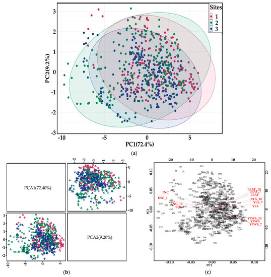 Classifying PC from site based on the epidemiological parameters; (a) PCA based on the first two principal components; (b) sample scatterplot displays the first two components in each data set in PCA; (c) contribution of each feature selected on the first component in PCA using the biplot. Note: Infection index (INC) in plants in the acorn stage, infection index in plants at 7 weeks of age (INC_7) and 10 weeks of age (INC_10); youngest leaf with symptoms on plants at the acorn stage (YLWS) (nº); youngest leaf with symptoms on plants at 7 weeks of age (YLWS_7) and on plants at 10 weeks of age (YLWS_10); youngest leaf spotted in plants in the acorn stage (YLS) (nº) at 7 weeks of age (YLS_7) and 10 weeks of age (YLS_10); state of the symptom (gross sum) (SIN); the number of functional leaves in plants in the acorn stage (LEAF) (nº) at 7 weeks of age (LEAF_7) and 10 weeks of age (LEAF_10).