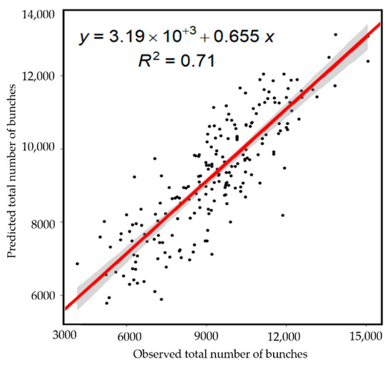 RMSE values were within the 95% confidence interval of 1054–1162 banana bunches, which is 11.51% of the observed average yield. The comparison between the number of banana bunches observed and predicted (Figure 3) indicates that the predictions of the RF model are in good agreement with the observations with a slope of 0.65 and the R2 of 0.71.