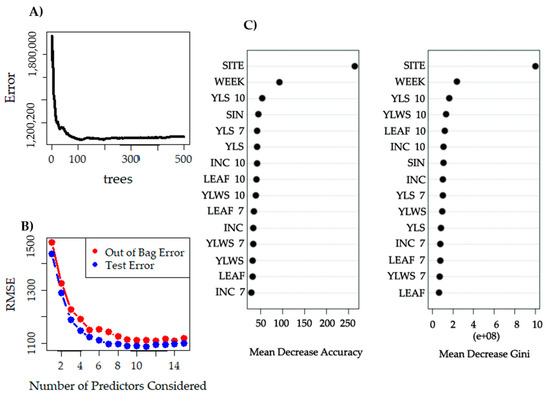 RF estimation for the number of banana bunches: (A) OOB error, (B) predictor variable importance graph, and (C) selection of a few variables using 3-fold cross-validation based on least RMSE.