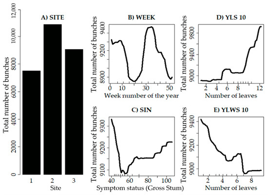 Partial dependence plots were useful to assess the relationship between each predictor and the response variable (Figure 5), measure the effect of explanatory variables, such as site (Figure 5a), week (Figure 5b), SIN (Figure 5c), YLS_10 (Figure 5d) and YLWS_10 (Figure 5e), on the variable number of banana bunches. Variable importance measures and partial dependence plots revealed unique responses concerning the evaluated variables. The RF model identified the trend of the YLS parameter in plants with 10 weeks of physiological age, being one of the most influential variables responsible for the increase in the number of bunches (>1000) during the four years; the ideal values of this parameter are between blade position 10 and 12 (Figure 5d). The site was ranked as the first and most important variable for estimating banana yield (Figure 5a). Likewise, the week was classified as the second most important variable for the number of banana bunches, since the yield or the banana bunches fell in weeks 18 to 22, which indicates that the week of the year can be a key factor to achieve a high yield of bananas in this site, based on the evaluation of the BS parameters (Figure 5b). For example, the partial dependence plot shows that the epidemiological parameters such as SIN were one of the main predictors of the number of banana bunches, with a saturation response at SIN values less than 40 (Figure 5c). The partial dependence graphs for other variables studied presented minor effects with very complex patterns that are difficult to explain through certain physiological or agronomic responses of bananas.