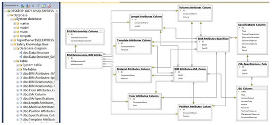 The third step is to build the knowledge base by integrating both the safety checking rules and the topological BIM elements, as shown in Figure 3. This can complete the safety rule check by executing SQL language. When the rules are executed, the required information is searched directly from the network diagram and matched with the specification expression to obtain the final results.