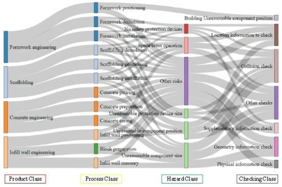 The four construction sub-items are decomposed by the JSA. Risk sources of each construction process are identified, including unreasonable component position, unreasonable component size, no safety protection devices, unreasonable protection device size, space cross operation, and other risks. The focus of safety checking is analyzed based on the identified hazards. The Sankey diagram is used to show the relationship between product class, process class, hazard class, and checking class, as shown in Figure 4. Finally, the JSA results are stored to establish a JSA database (JSAD).