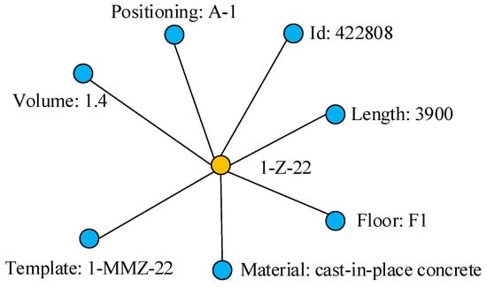The A-CTG is the graphic combination of component entities and their attributes in a BIM model. Component entities signify building components (such as beams, columns, floors, walls, stairs, etc.), and other accessory components (such as openings, railings, etc.). According to different categories, the entity attributes are divided into basic information (element ID), geometric information (length, volume, area, spatial relationship, etc.), physical information (performance, material, quantity, weight, etc.), location information (relative position of construction), and affiliated information (including the scaffold and template attached to the component). Considering a model element as an example, the component entity and component attributes are extracted, as shown in Table 3. The component attributes are extracted from the model by Dynamo in a visual programming way, as shown in Figure 5.