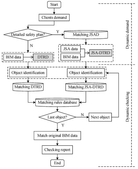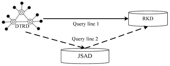 Two different checking paths are designed in this study, including the direct checking path of the DTRD and the RKD, and the rule checking path, as shown in Figure 10. These safety checking paths based on the DTRD-(JSAD)-RKD performing safety checking tasks dynamically according to the user’s requirements. Among them, query line 1 (DTRD-RKD) detects safety design defects by checking the complete BIM model directly, which is suitable for the overall checking process. This allows users to check the general safety risk items in the construction design scheme. Query line 2 (DTRD-JSAD-RKD) detects the safety checking path designed for dynamic checking, which is suitable for special construction safety detailed design. Under this path, the DTRD of different process stages is selected based on the JSAD first. Then, it matches with the RKD and outputs the safety checking results combined with the construction process.