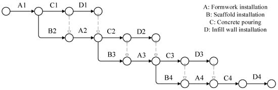 This research aims to propose a construction safety dynamic checking method that matches the actual construction process. A four-story concrete structure office building is used to verify the construction dynamic safety checking method proposed in this article. Firstly, a simulated dynamic BIM with actual construction processes is established. In the model preparation, the main structure is built using Revit software, and the temporary facilities are automatically generated using the modeling master (construction) software developed by Hongwa Technology Company []. The overall construction PERT of this office building is shown in Figure 12. The component attributes and topological relations between components can be extracted through Dynamo, and the topological network can display the attributes of each component and its associated components. Taking the vertical hole 4-SD-3 as an example, the topological network can display the height, length, position, and other attributes of this component, while its related components are only the wall 4-Q-2, as shown in Figure 13. However, according to the specification, if the short side length of the vertical hole is not less than 500 mm, protective railings shall be set at the free side. Because the associated railings are not found, the safety checking result will show that it is unsafe.