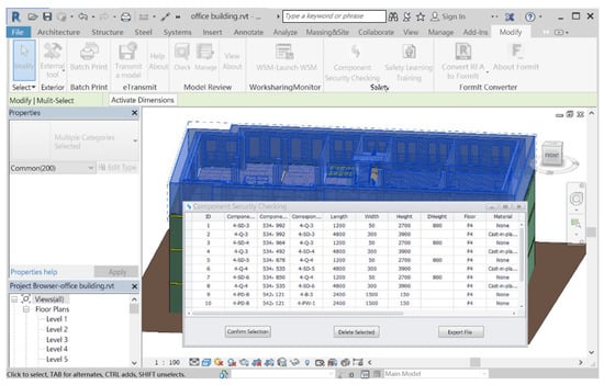 The specific safety checking results are output in the form of a dialog box. The information displayed in the dialog box mainly includes the name of the unsafe component, the component ID in Revit, the associated components, the attribute, and reference specification clauses. The component can be selected through the pop-up result dialog box to display the checking information of the selected component and automatic positioning, as shown in Figure 15, which is convenient for safety managers to locate and to investigate unsafe components and take measures.