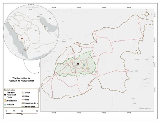 The Holy Sites and the Makkan Sanctuary are located in the western part of the Kingdom of Saudi Arabia in the Makkah region, between longitudes 47°37′39″ and 55°58′39″ E and between latitudes 21°18′46″ and 21°58′31″ N (Figure 1). Makkah is considered the heart of the Islamic world and the center of the globe. Makkah is located in the northern hemisphere. The longitude of Makkah (global zero) divides the world into two parts, one to the east of it and one to the west (Association of Neighborhood Centers in Makkah) [].