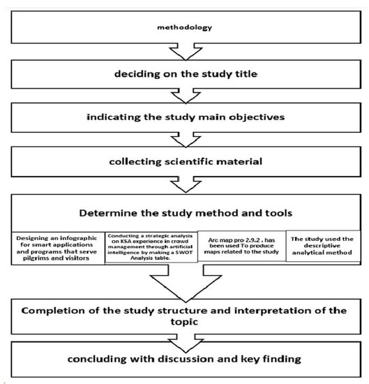 The Arc Gis Pro 2.9.2 (Esri, Redlands, CA, USA) software was used to produce and output the maps needed for the study. A strategic analysis was also conducted on the experience of the Kingdom of Saudi Arabia in crowd management through artificial intelligence by means of a SWOT analysis for the study area.