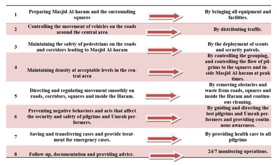 Sample crowd management tasks. Source: Prepared by the researchers with reference to the Unified National Platform Website https://www.my.gov.sa/wps/ (accessed on 1 September 2022).