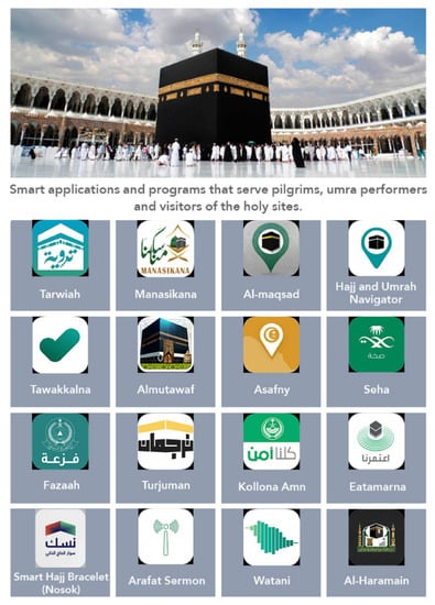 - The Unified National Platform, Hajj and Umrah, Kingdom of Saudi Arabia. Available online: https://www.my.gov.sa/wps/portal/snp/aboutksa/hajjandUmrah#header2_4 (accessed on 19 February 2022).