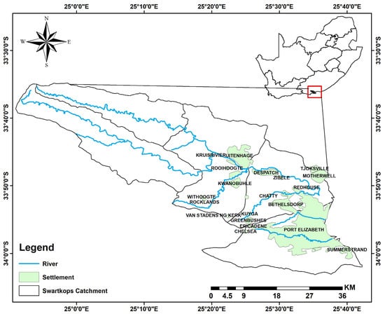 The Swartkops River catchment is located in the Eastern Cape Province of South Africa (Figure 1). The catchment is about 1555 km2, with a population of about 1.2 million people. The city of Port Elizabeth, and the industrial town of Uitenhage, residential towns of Despatch and Perseverance, Motherwell, Zwide, and KwaNobuhle are all within the Swartkops catchment. The Elands and KwaZunga Rivers are the two main tributaries of the Swartkops River, whereas the Brak and Chatty are regarded as subsidiary tributaries. The Swartkops River discharges into the Algoa Bay via its 16 km-long estuary. The estuary is permanently open, having the third largest inter-tidal salt marsh of South African estuaries [25]. The estuary is ecologically important, as it serves as a critical breeding ground for many important bird and fish species.