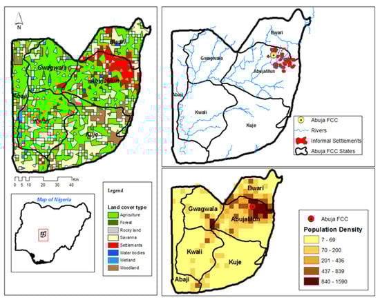 Map of the Federal Capital Territory (FCT) showing rivers, land cover type and population density, and the location of the FCT in Nigeria.